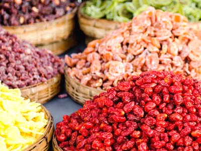 北京果脯蜜餞的品種很多,果脯和蜜餞的區(qū)分,按照在北京的習慣,把含水分低并不帶汁的稱為果脯。例如:蘋果脯、梨脯、杏脯、桃脯、沙果脯、香果脯、海棠脯、棗脯(又稱金絲蜜棗)青梅脯、紅果脯等。因為以上果脯是把原料經(jīng)過處理,糖煮,然后干燥而成,其色澤有棕色、金黃色或琥珀色,鮮亮透明,表面干燥,稍有粘性,含水量在20%以下。這種果制品,也稱“北果脯”或“北蜜”,是北方形式的果脯蜜餞意思。而冬瓜條、糖荸薺、糖藕片、糖姜片等表面掛有一層粉狀白糖衣的稱為糖衣果脯,也叫“南果脯”或“南蜜”,是來自福建、廣東、上海等南方果脯蜜餞的意思,其質地清脆,含糖量多。蜜餞是經(jīng)蜜或糖煮不經(jīng)干燥工序的果制品,表面濕潤柔軟,含水量在30%以上,一般浸漬在糖汁中,如蜜餞海棠、蜜餞山楂等,但是近年來,這種產(chǎn)品只有一些前店后廠的自產(chǎn)自銷的商店生產(chǎn),因為它不易儲存和運輸。